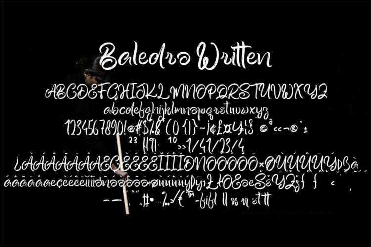 Baledro includes a complete set of uppercase and lowercase letters, as well as multi-language support, numbers, punctuation.