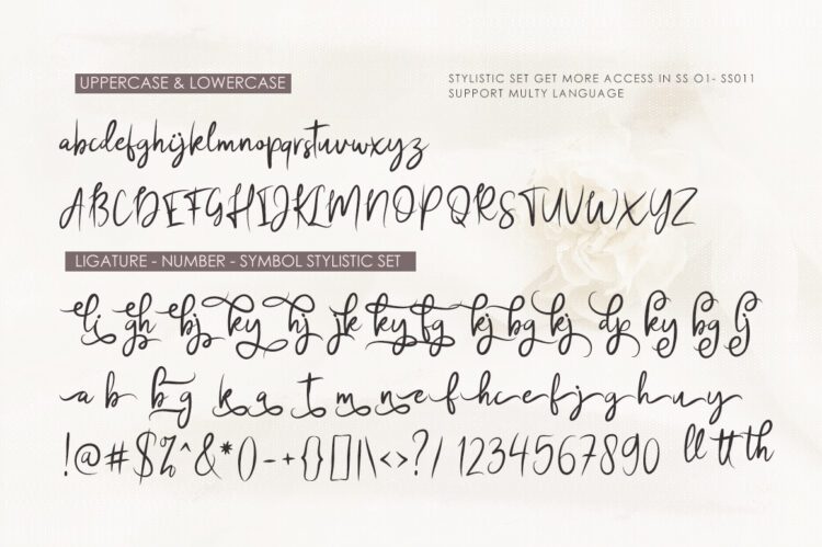 Themystory is likely a font designed to emulate the look of traditional calligraphy. Calligraphy fonts are characterized by elegant, flowing strokes that mimic the appearance of handwritten script produced by a skilled calligrapher. Variant might refer to a specific style or design within the broader category of calligraphy fonts. These fonts are often used for formal invitations, wedding stationery, certificates, and other designs where a sophisticated and classic aesthetic is desired.