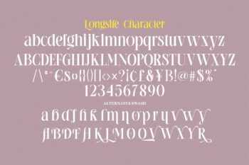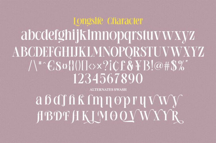 Longsile was built with OpenType features and includes initial and ending stylistics, alternative characters for most lowercase letters, numbers, punctuation, alternatives, ligatures and also supports other languages.