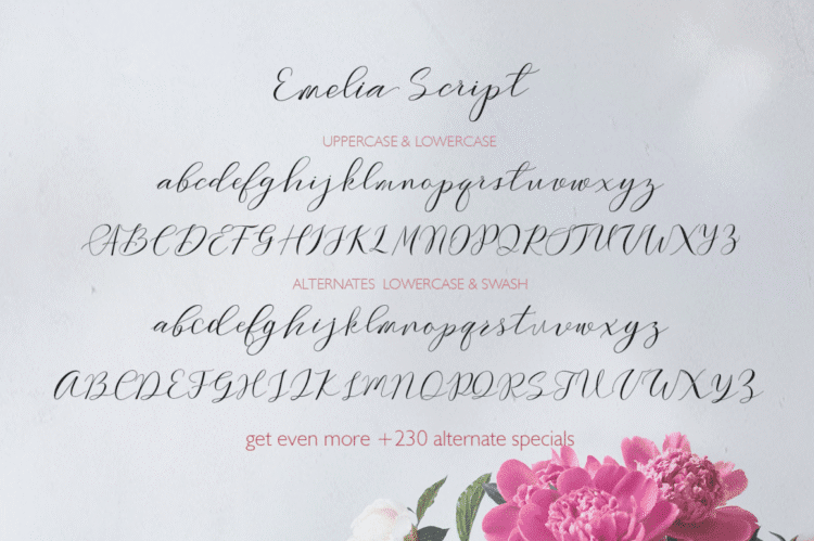 Emelia Script is modern calligraphy script font, every single letters has been carefully crafted to make your text looks beautiful. With modern script style this font will perfect for many different project, example: invitations, greeting cards, posters, name card, quotes, blog header, branding, logo, fashion, apparel, letter, stationery and more!