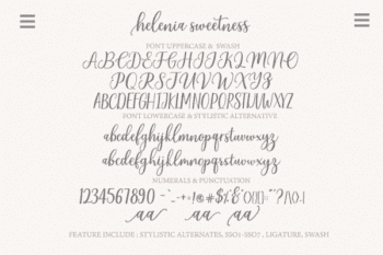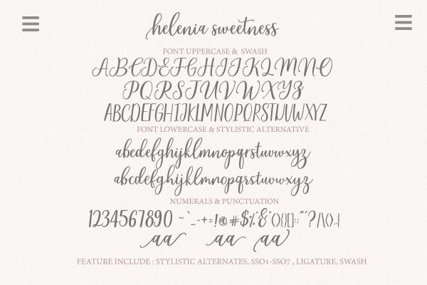 Helenia Sweetness: Uppercase & Lowercase International Language & Symbols Support Punctuation & Number PUA Unicode Range Standard Stylistic Alternates Stylistic Character Variant of ligatures.