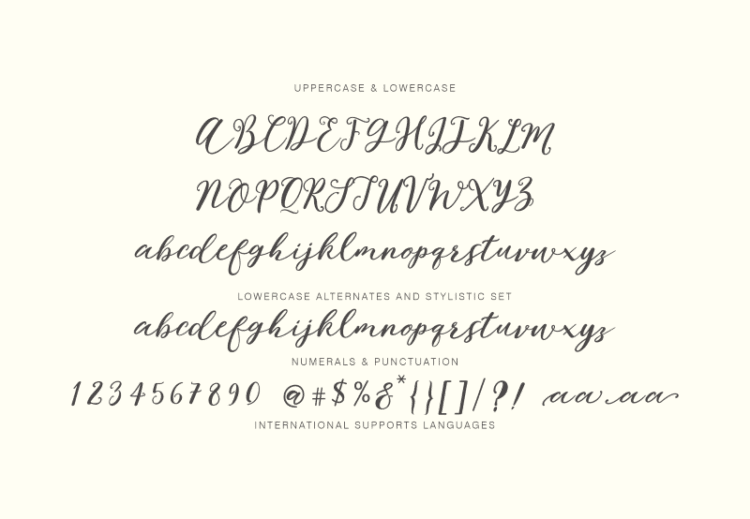 Hey Jamila Script: Uppercase & Lowercase International Language & Symbols Support Punctuation & Number PUA Unicode Range Standard Stylistic Alternates Stylistic Character Variant of ligatures.