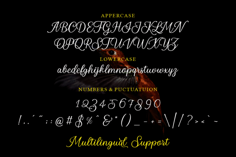 Swallow Script : Uppercase & Lowercase International Language & Symbols Support Punctuation & Number PUA Unicode Range Standard Stylistic Alternates Stylistic Character Variant of ligatures.